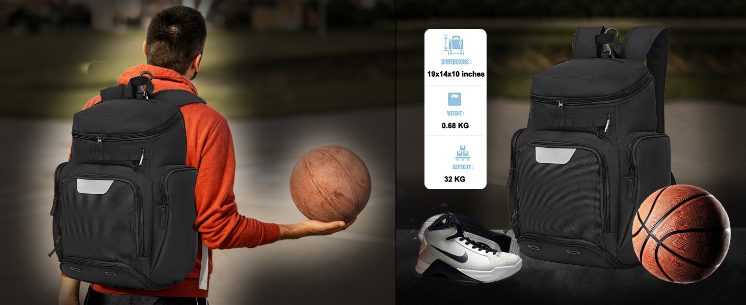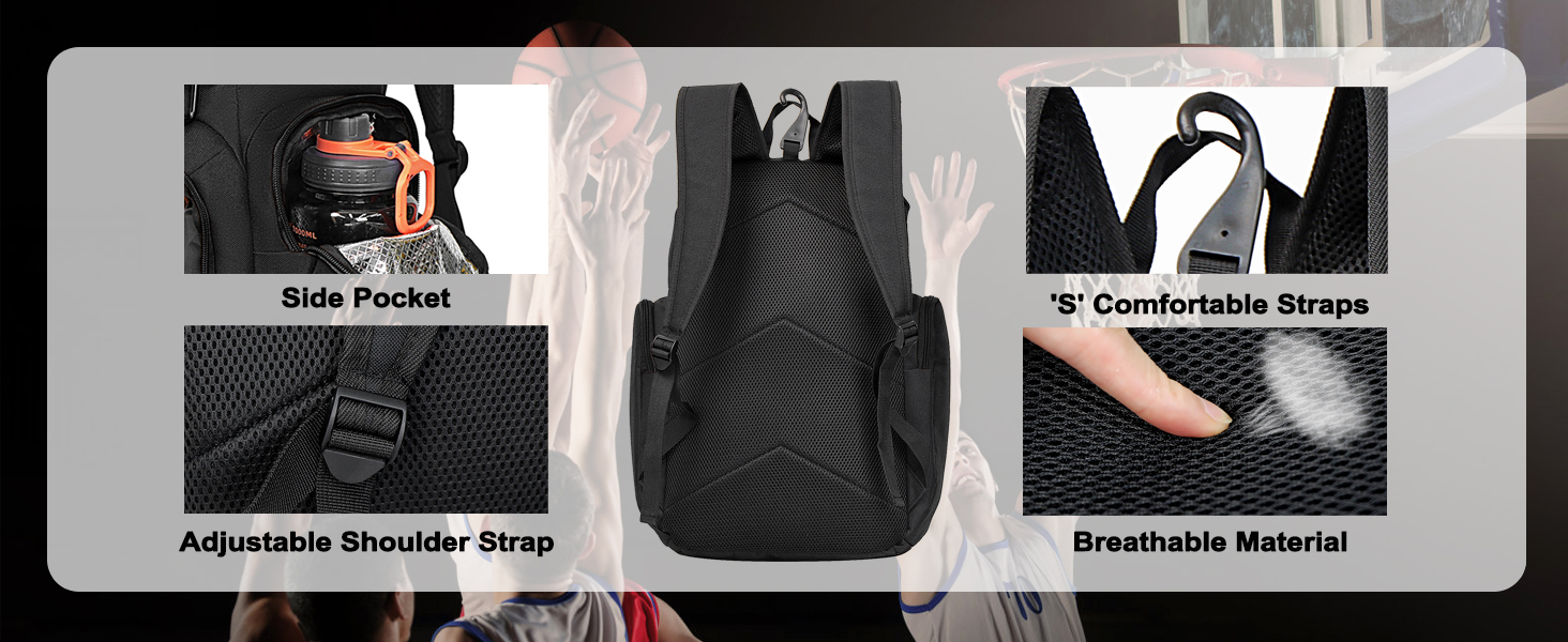 The basketball backpack is designed of water-resistant wear-resistant fabric.