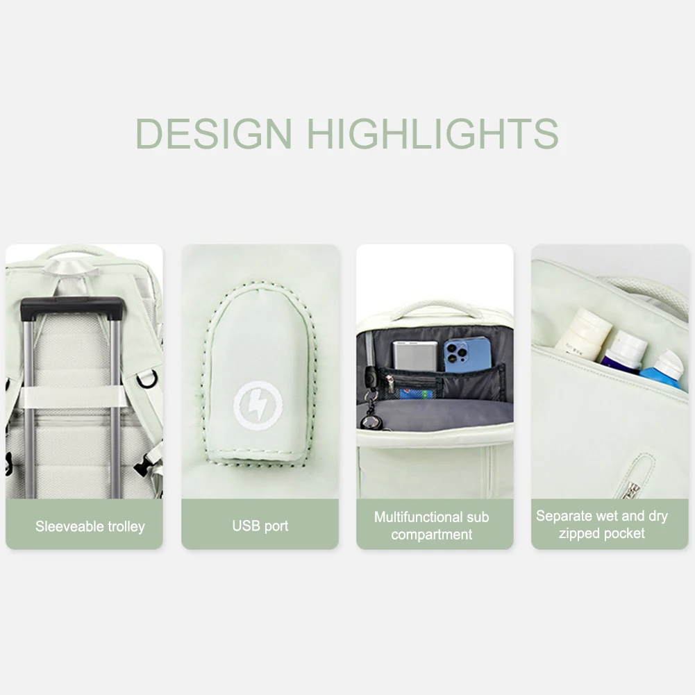 4.Combination of Backpack and Luggage: The backpack is equipped with a back luggage strap, which allows you to secure it onto a rolling suitcase. This integration effectively reduces the burden of carrying both a backpack and a suitcase, making your daily use more convenient and comfortable.