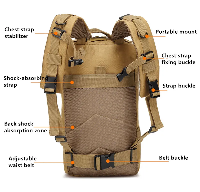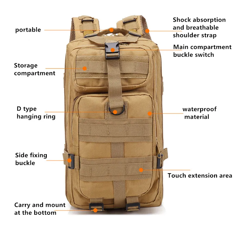 Specification: Item type: Backpacks Backpacks type: tactical backpack softback Backpack Usage: Camping & Hiking ForTactical Backpack Closure Type: Zipper Occasion : Outdoor Style: SportsTactical Backpack Capacity: About 30L Mainmaterial: Oxford waterproof Size details:45cm*23cm*25cm Package list: 1 * Outdoor backpack