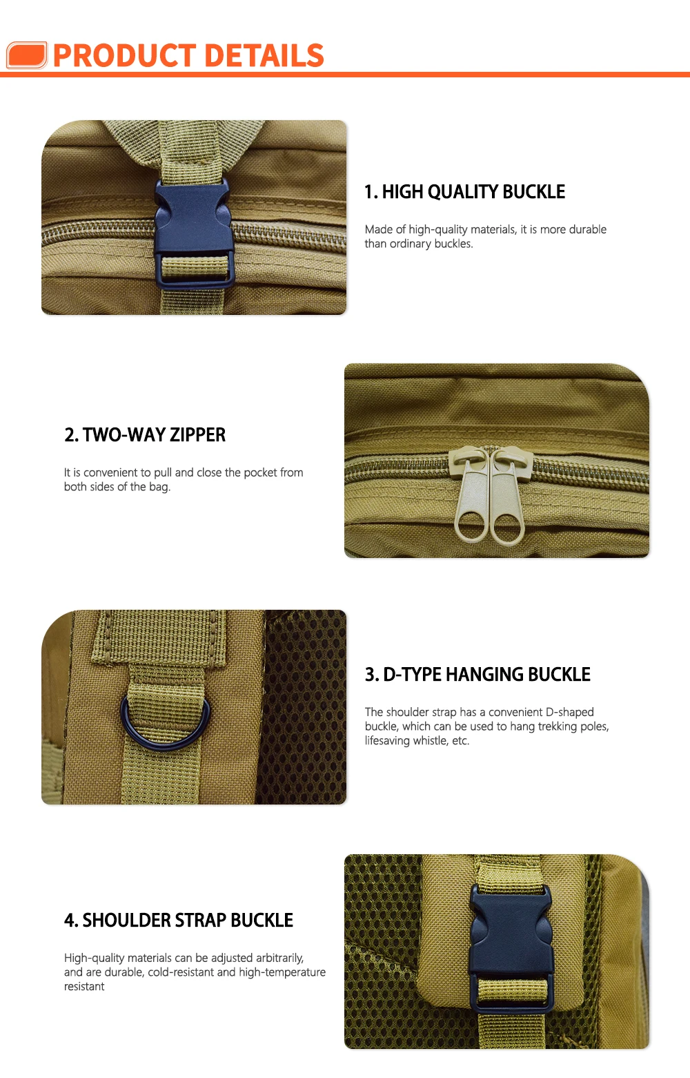 • Durable Material:Made from high-quality nylon, this backpack is built to withstand tough outdoor conditions.